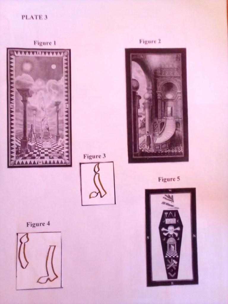 The main elements of the tracing board of the Third Degree Plate 3 figure 5 I wish to highlight, are an acacia tree growing at the top of a coffin, upon the coffin is a human skull atop two crossed thigh bones; below this is depicted a doorway, with a curtain drawn aside to allow entry.